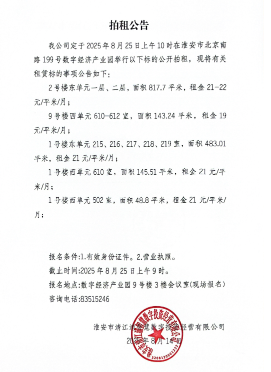 淮安市北京南路199號(hào)數(shù)字經(jīng)濟(jì)產(chǎn)業(yè)園8.25公開拍租